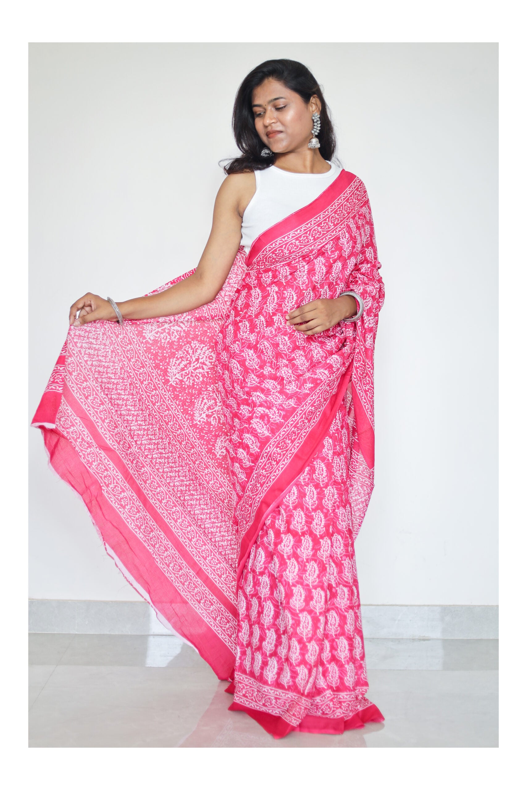 This Bagru Print Pink Mulmul Cotton Saree is not just a regular saree. It is hand-crafted with a traditional block printing method called Bagru to create a unique and eye-catching design. Made with airy and comfortable mulmul cotton, this saree will keep you cool and stylish all day. Perfect for any occasion.