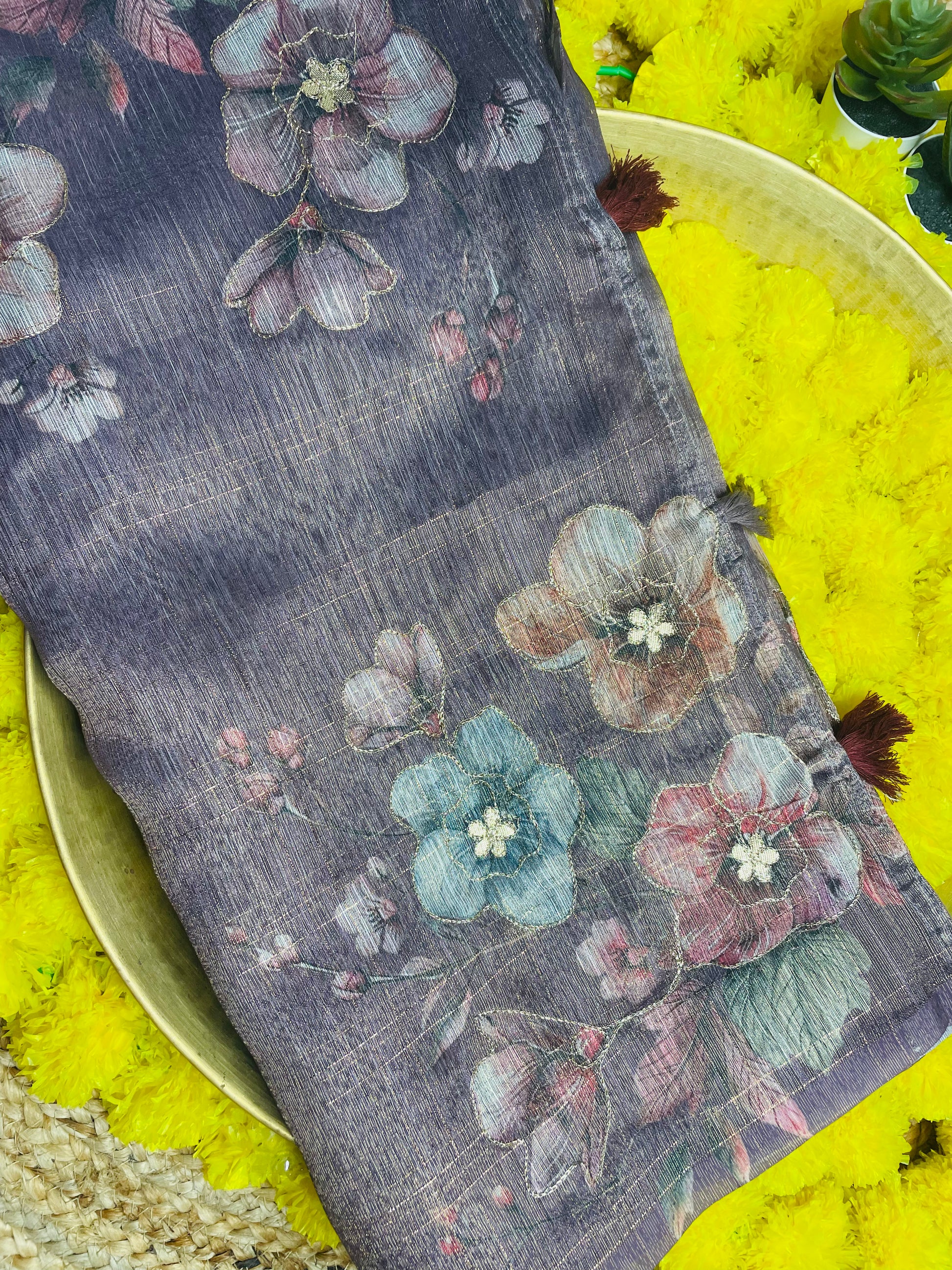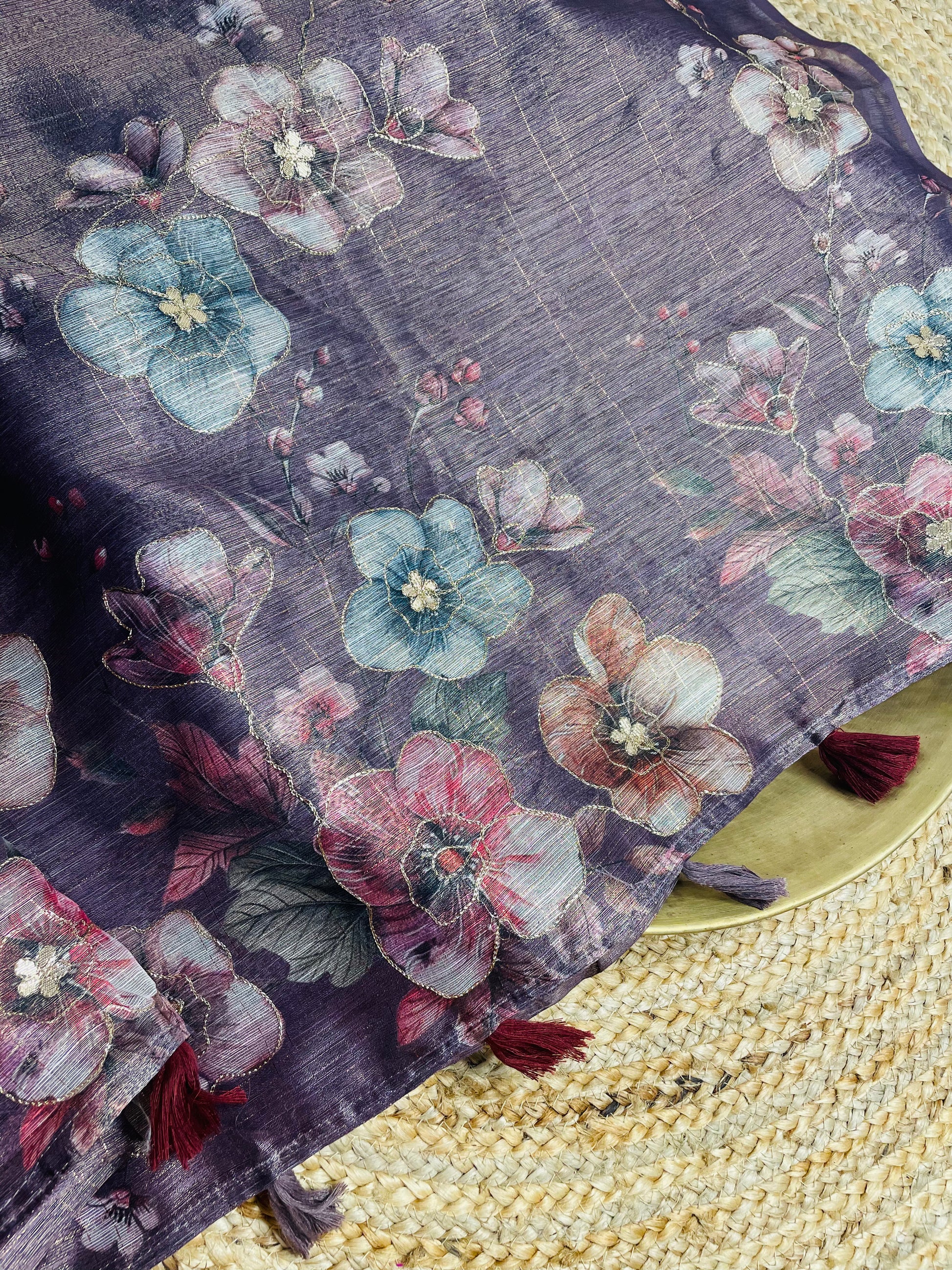 Drape yourself in elegance with our Wine colour Tissue Cotton Saree, a perfect blend of comfort and festive charm. Crafted with fine cotton yarns woven with subtle tissue zari and gotta patti touch, this saree offers a soft, breathable feel while giving a graceful shimmer. This saree is your go to for every celebration.