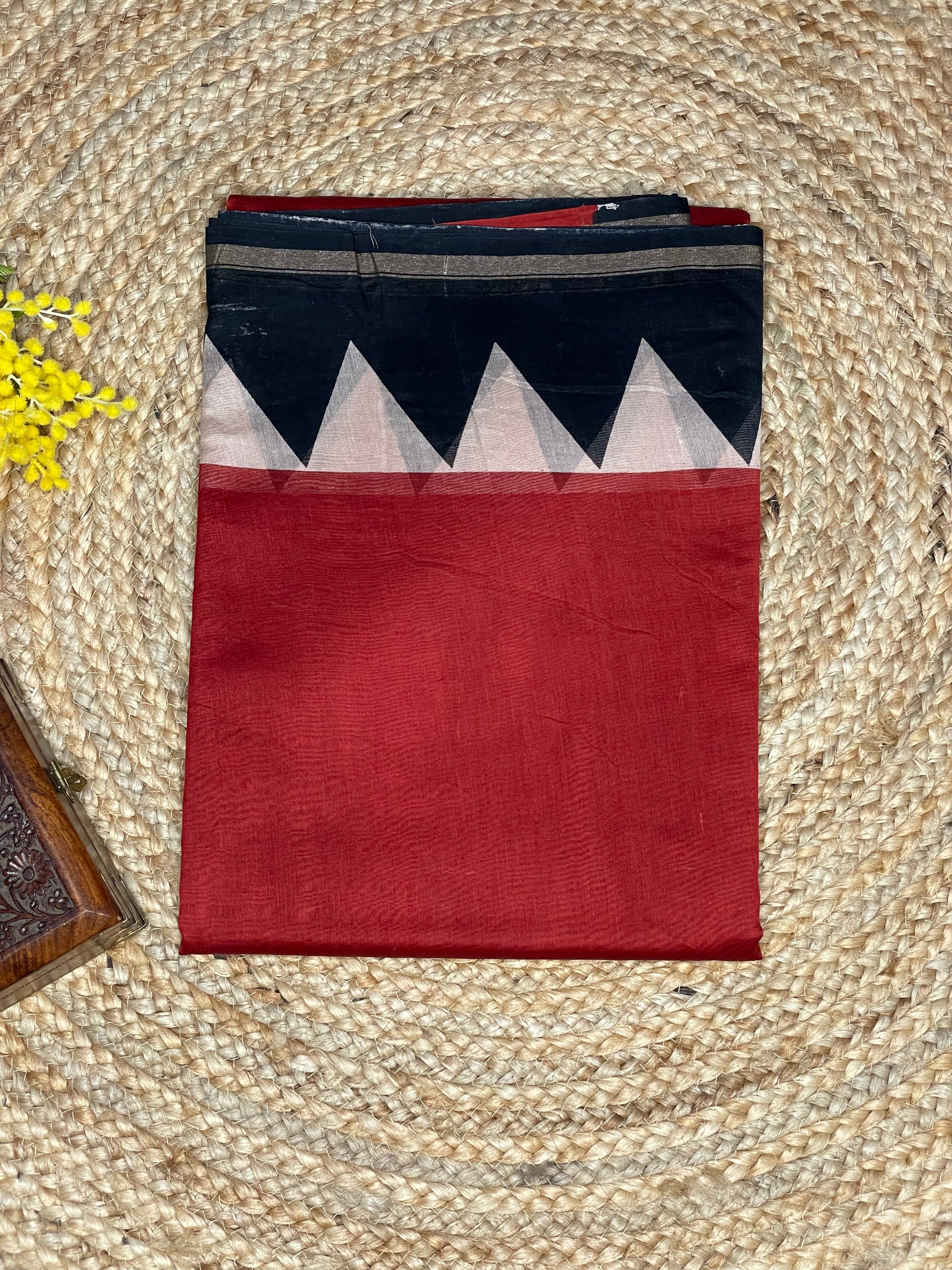 Crafted in lightweight Chanderi cotton silk, this saree features a vibrant red body with a striking black border. The border is highlighted with bold white triangular motifs, giving it a modern yet traditional charm. Soft in texture and easy to drape, it is perfect for festive occasions, cultural gatherings, and office wear. This saree will make you stand out and its soft and smooth texture ensures a comfortable and stylish wear. Upgrade your wardrobe with this must-have saree now!
