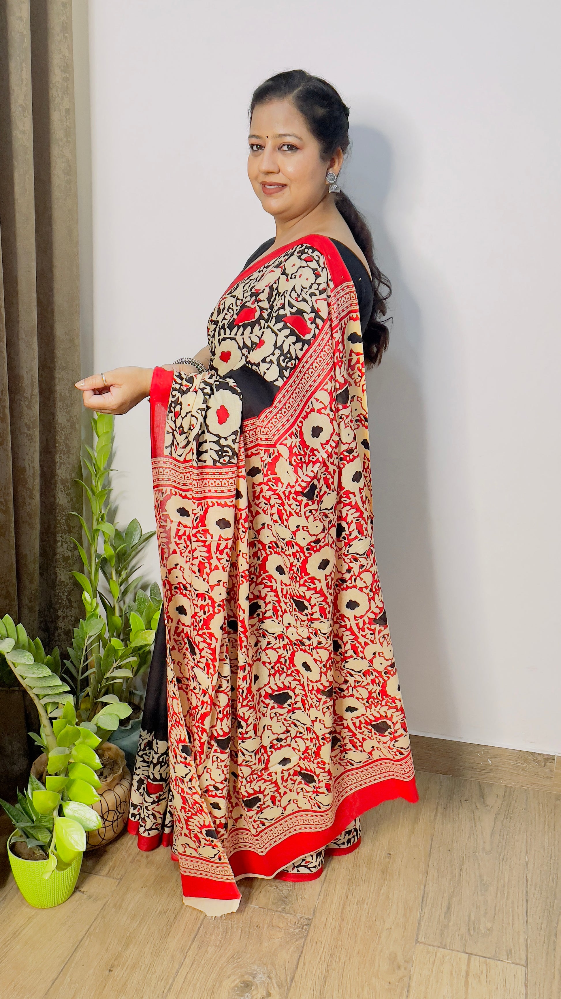 Embrace sophisticated elegance with our Red Bordered Black Mulmul Cotton Saree. This breathable, lightweight fabric ensures daylong comfort while the striking contrast of vibrant red borders against deep black creates a captivating visual appeal. The premium mulmul cotton offers a graceful drape that flatters your silhouette beautifully. Perfect for both festive occasions and formal gatherings, this versatile saree pairs wonderfully with traditional jewelry to complete your look. We're confident you'll treasure this timeless piece that combines classic design with exceptional craftsmanship.