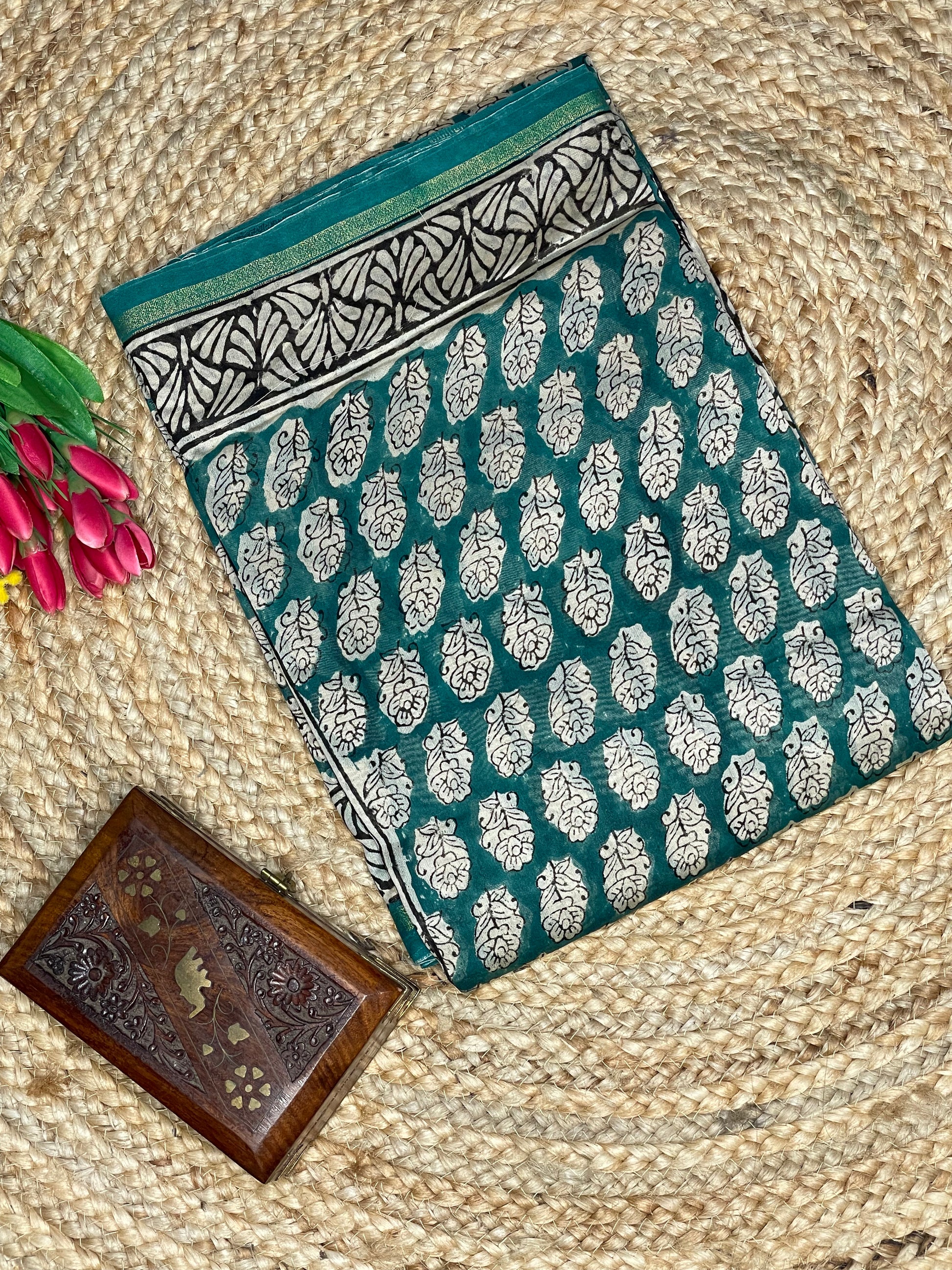 Turquoise Chanderi Cotton Silk Saree. Adorned with delicate white floral motifs and a beautifully woven black & white border, this saree is the perfect blend of grace and comfort. Lightweight, soft, and easy to drape, it’s ideal for festive gatherings, office wear, or casual celebrations. Let its refreshing charm make every moment special. This saree will make you stand out and its soft and smooth texture ensures a comfortable and stylish wear. Upgrade your wardrobe with this must-have saree now!