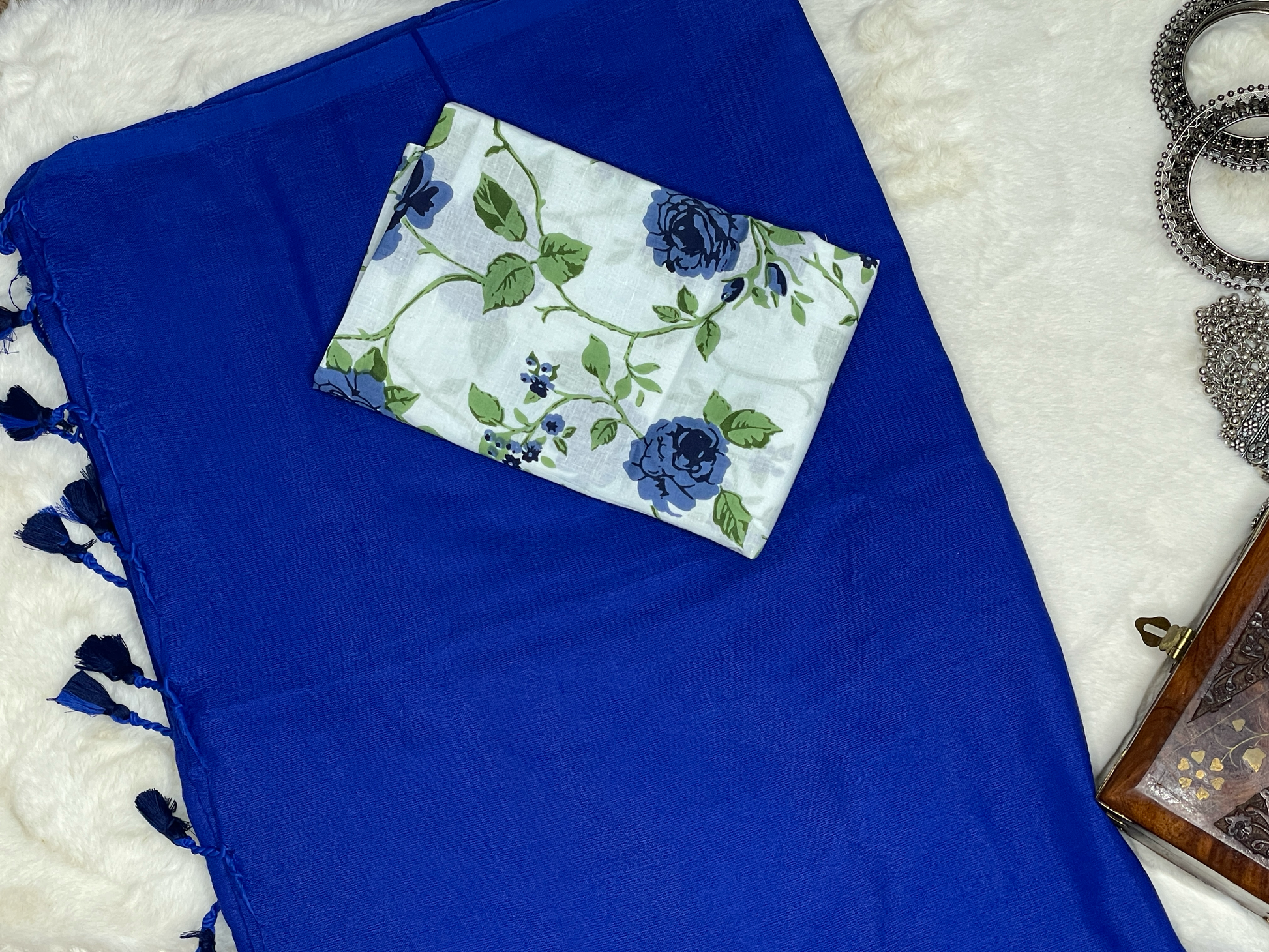 A Royal Blue Khadi saree with a printed blouse offers a blend of traditional craftsmanship and contemporary style, making it an appealing choice for customers seeking both comfort and elegance. The Khadi fabric, known for its breathability and handwoven texture, provides a comfortable drape suitable for various occasions. Paired with a printed blouse, the saree gains a modern touch, allowing for personalization and unique styling.
