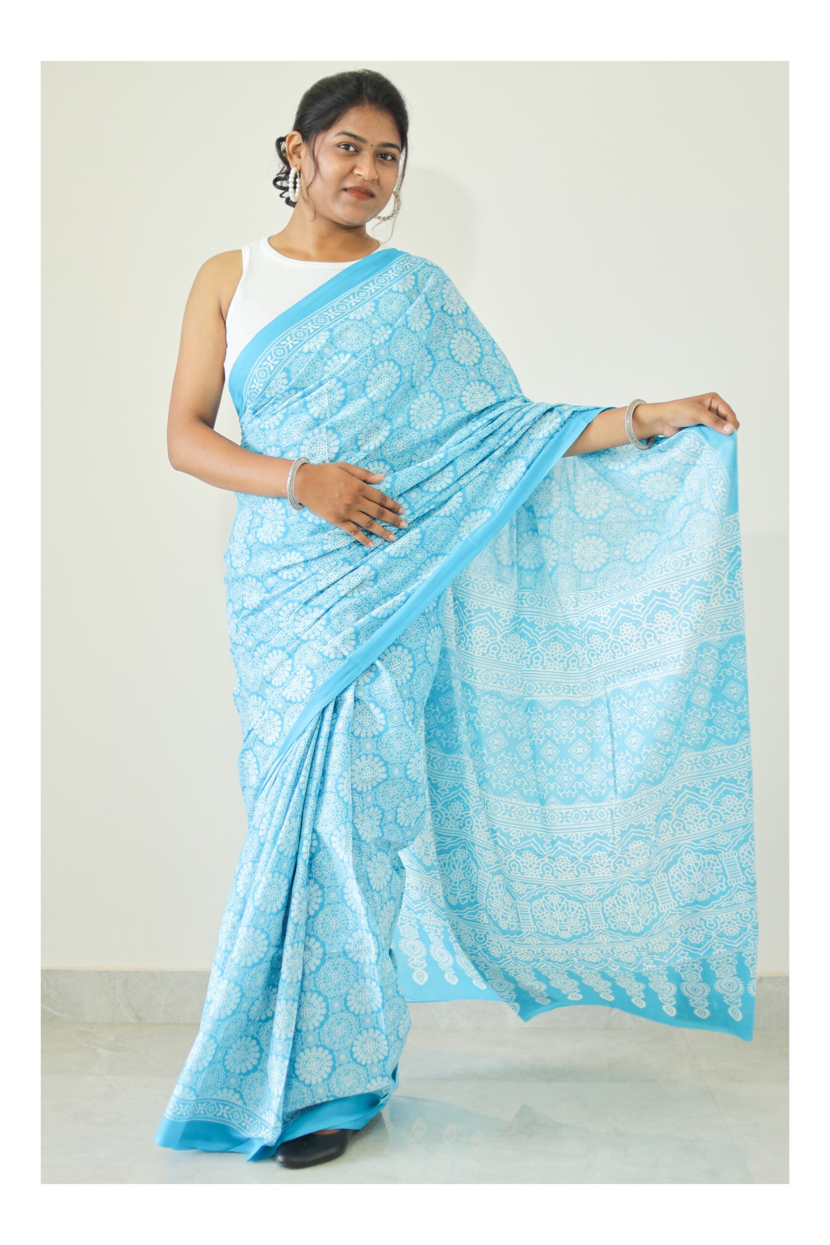 Introducing the Sky Blue Mulmul Cotton Saree, a must-have for any fashion-forward individual. Made from high-quality mulmul cotton, this saree boasts a stunning sky blue color that will make you stand out from the crowd. Its lightweight and comfortable fabric will keep you feeling cool and confident all day long. Upgrade your wardrobe with this versatile and stylish saree!